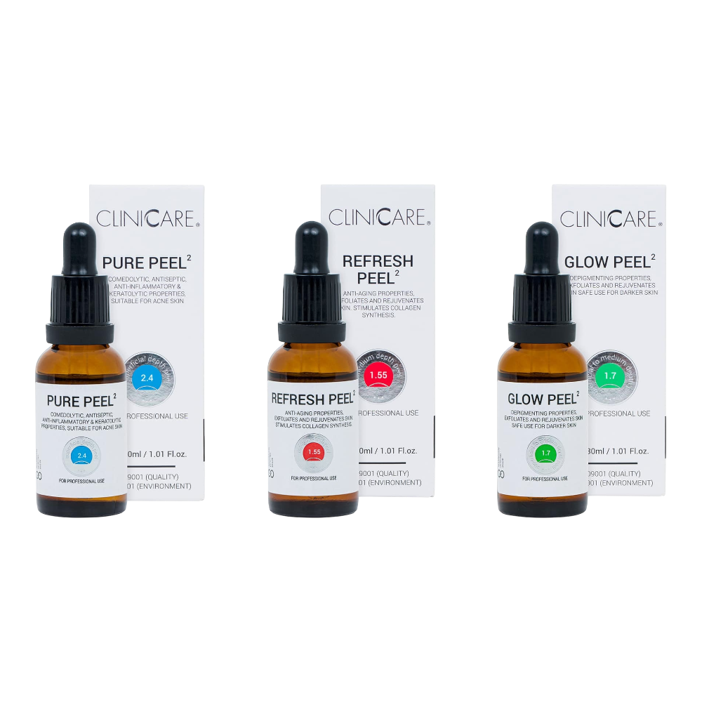 The CLINICCARE Refresh Peel is a professional, superficial-to-medium depth chemical peel designed for an anti-aging and skin rejuvenation effect. It helps improve the clinical appearance of the skin by stimulating collagen synthesis, reducing fine lines, and creating a brighter, more even complexion.