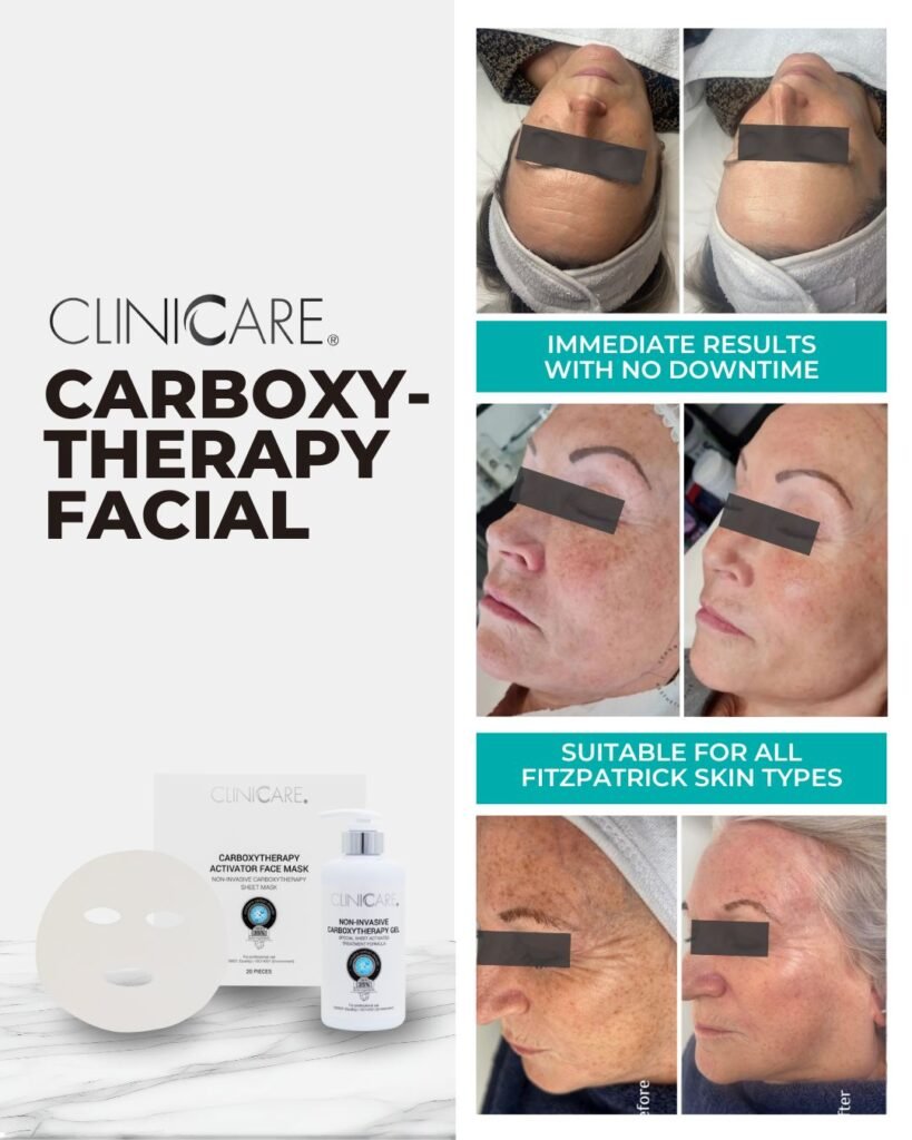 CLINICARE Non-Invasive Carboxytherapy is a facial treatment that infuses the skin with carbon dioxide (CO2) using a gel and activator mask, triggering increased oxygen flow to stimulate collagen, brighten skin, reduce dark circles, tighten tissue, and improve circulation for rejuvenation without needles, offering immediate radiance and cumulative results after a series of sessions.